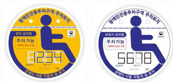 장애인 주차구역에 차를 댈 수 있는 차량에 발급되는 주차표지는 두 종류입니다. 하나는 '본인 운전용' 노란색 스티커이고 다른 하나는 '보호자 운전용' 하얀색 스티커입니다.